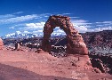 Delicate Arch in Arches National Park with La Sal Mountains in the distance.